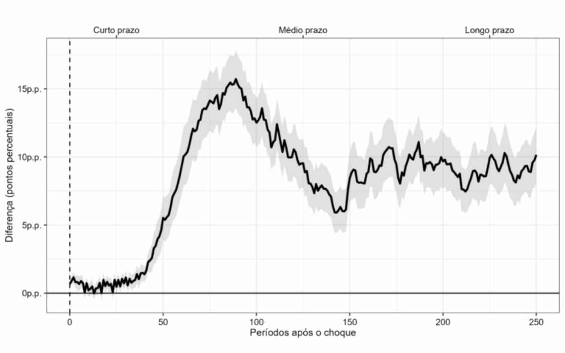 Ademais, a pejotização irrestrita provocará, segundo o modelo, o aumento da desigualdade social, calculado a partir do índice de Gini das rendas do trabalho. No longo prazo, estima-se um acréscimo de até 10 pontos percentuais na desigualdade, como mostra a Figura 3.