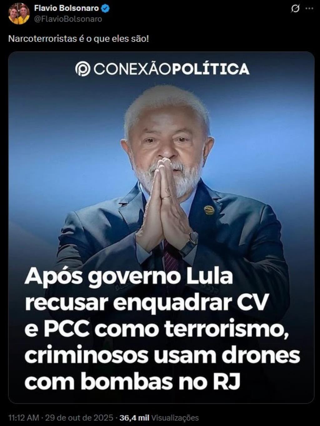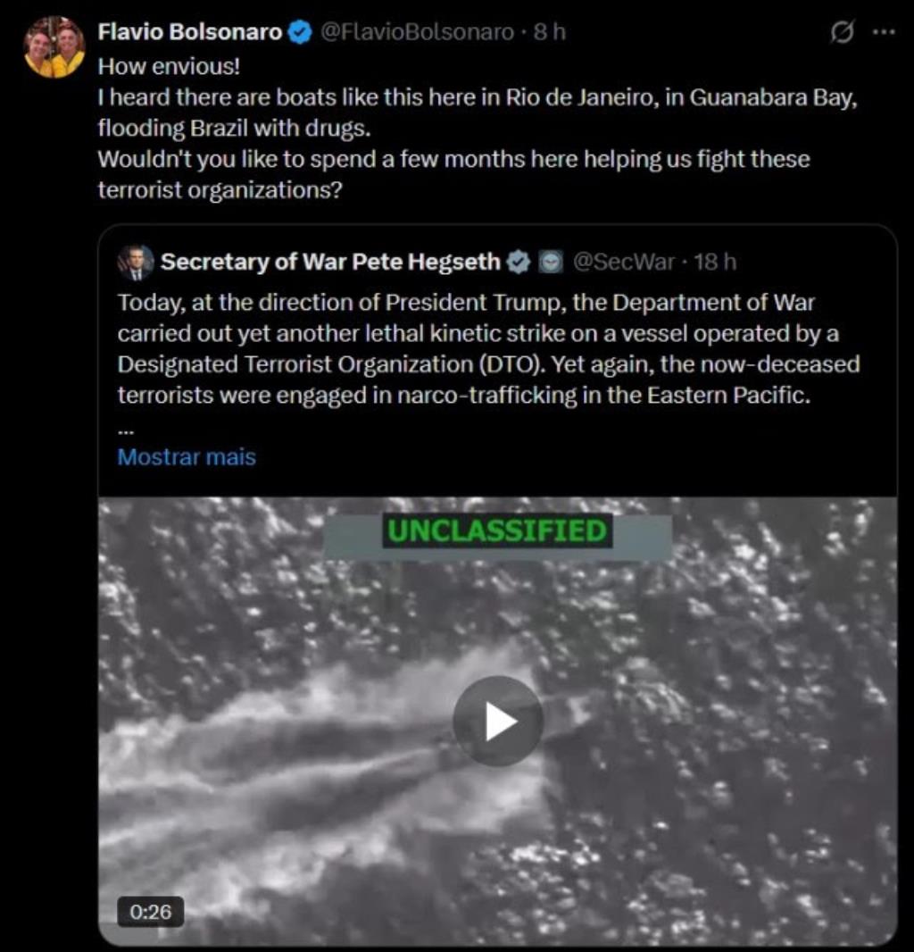 Especialistas avaliam o projeto como uma ‘pauta-bomba’ que abre espaço para “intervenções estrangeiras” no Brasil, como já mostrou a Pública. A proposta emerge no momento em que navios e caças do Exército dos Estados Unidos têm abatido embarcações e matado pessoas no mar do Caribe para combater o “narcoterrorismo” e após o senador Flávio Bolsonaro (PL-RJ) se manifestar publicamente defendendo que o mesmo seja feito nas águas do Rio de Janeiro.