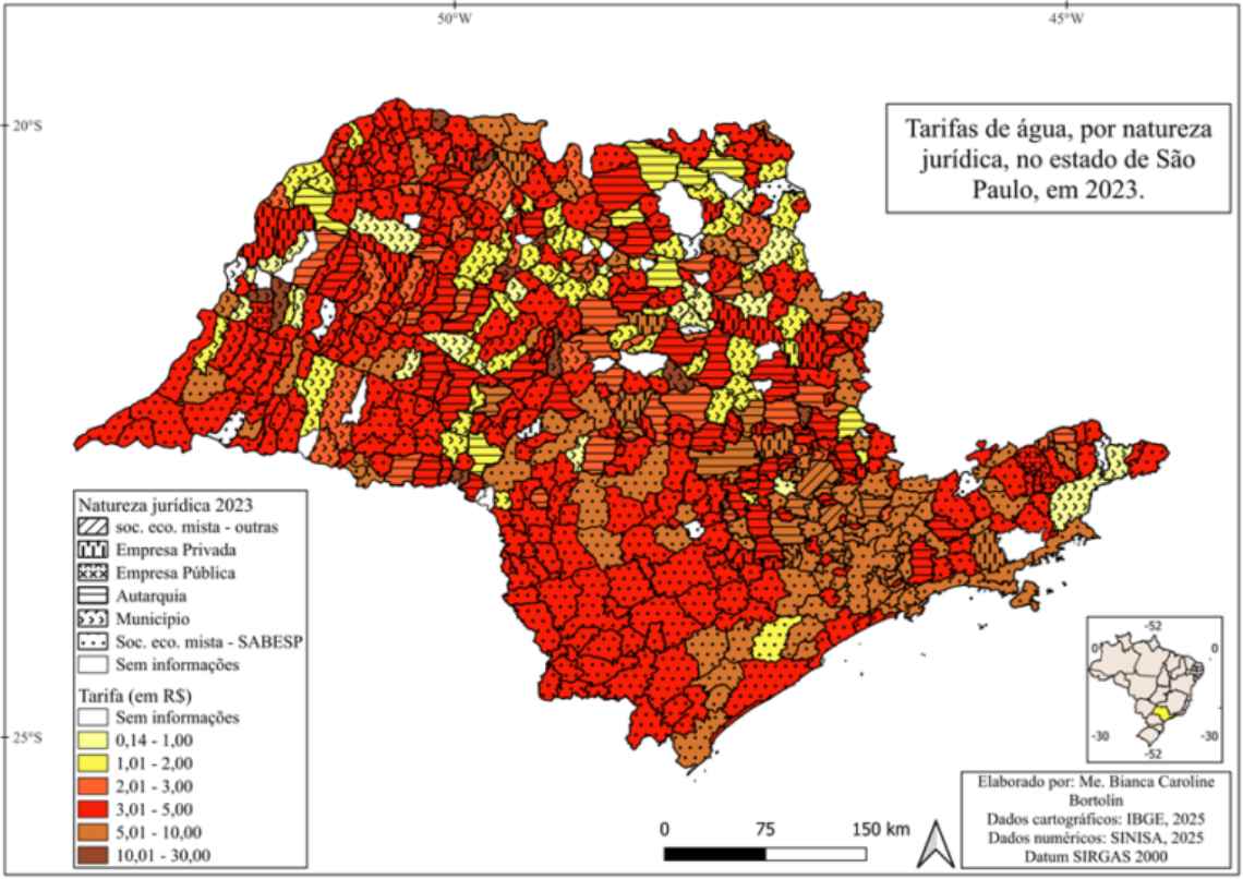 Figura 3 – Tarifas de água praticadas e natureza jurídica dos prestadores de serviços de abastecimento, no estado de São Paulo, em 2023.