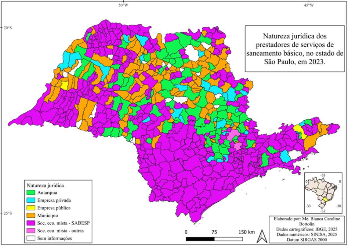 O primeiro elemento técnico central é a distribuição territorial dos prestadores de serviços. O mapa de espacialização por natureza jurídica (Figura 1) demonstra que, em 2023, a Sabesp era responsável pela prestação de serviços de abastecimento de água e esgotamento sanitário em mais da metade dos municípios paulistas. Considerando os 645 municípios do estado, isso significa que um único prestador concentrava o controle operacional sobre centenas de sistemas locais.