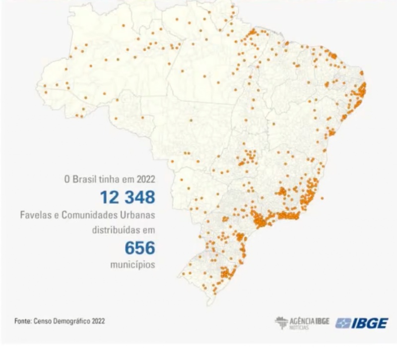 Todos os pontos laranjas no mapa abaixo indicam a existência de assentamentos com cara de favela. Entretanto, segundo o Instituto Brasileiro de Geografia e Estatística (IBGE), os assentamentos subnormais estão localizados em apenas 656 dos mais de 5.500 municípios do país. Esse número é risível. Aposto que cada um de nós que está em uma cidade diferente tem certeza de que no seu município tem assentamentos e bairros autoconstruídos, comunidades urbanas assemelhadas às favelas.