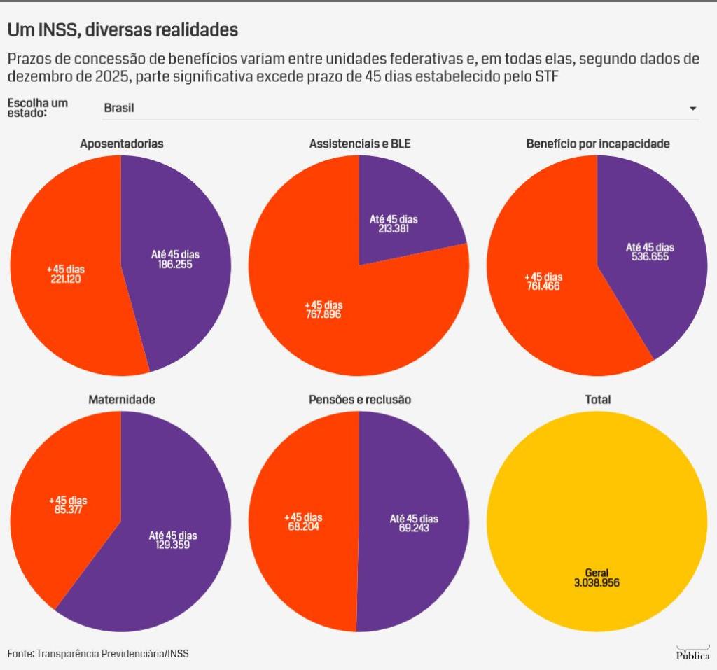Quem necessita acionar o INSS por um benefício ou aposentadoria tem desafios diferentes a depender de onde viva. Até dezembro de 2025, o tempo médio de concessão (TMC) era de 50 dias. No entanto, há uma disparidade regional notável, com esse prazo chegando a 28 dias no Distrito Federal e a 102 dias para quem vive no Acre.