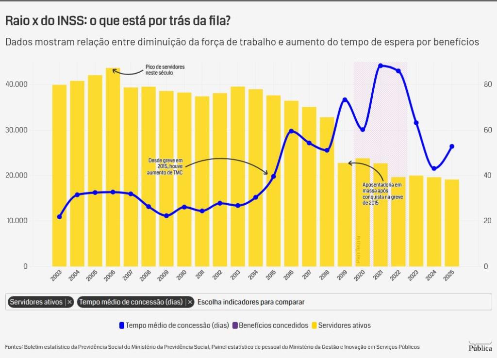 A Agência Pública investigou dados dos últimos 20 anos para identificar os principais gargalos que fazem a fila do INSS aumentar e o órgão lidar com a perda de servidores. Se de um lado há estados que aguardam uma média superior a 100 dias para ter o caso sequer analisado, do outro, trabalhadores do órgão reclamam de número insuficiente de vagas, problemas tecnológicos e condições de trabalho que levam até ao adoecimento. O resultado vem sendo a certeza de que apenas o esforço não tem sido capaz de fazer frente ao tamanho do problema para manter o funcionamento da estrutura de um dos maiores sistemas de proteção social do planeta.