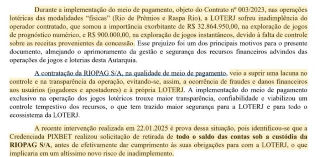 Como exemplo da alegada falta de controle nas contas do contrato, a Loterj relata que em 22 de janeiro de 2025 a “credenciada Pixbet realizou a solicitação de retirada de todo o saldo das contas sob a custódia da RioPag S/A, antes de efetivamente dar cumprimento às suas obrigações” com a loteria oficial do RJ.