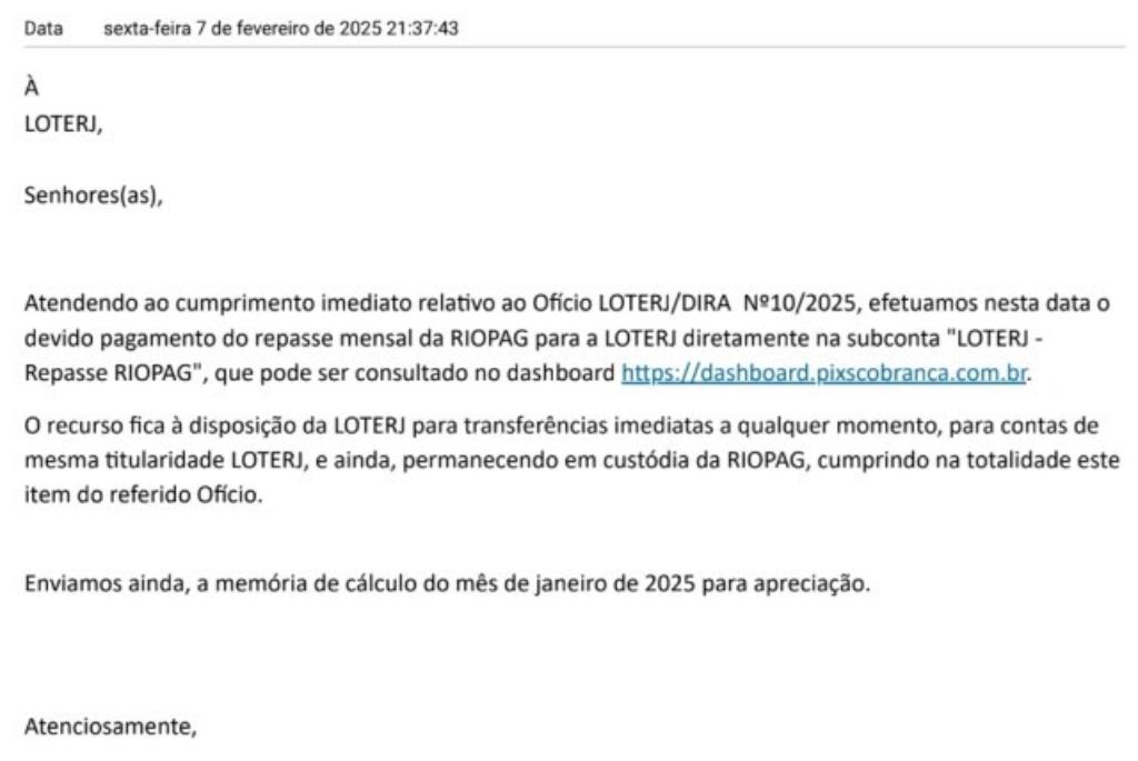 Na versão detalhada do relatório, a Loterj cita um email da RioPag para afirmar que a empresa “reconheceu a determinação administrativa” e “informou a implementação do mecanismo de custódia dos valores devidos à Autarquia, em 07 de fevereiro de 2025, com a alocação dos recursos em subconta específica, devidamente segregada, rastreável e acessível à fiscalização”.